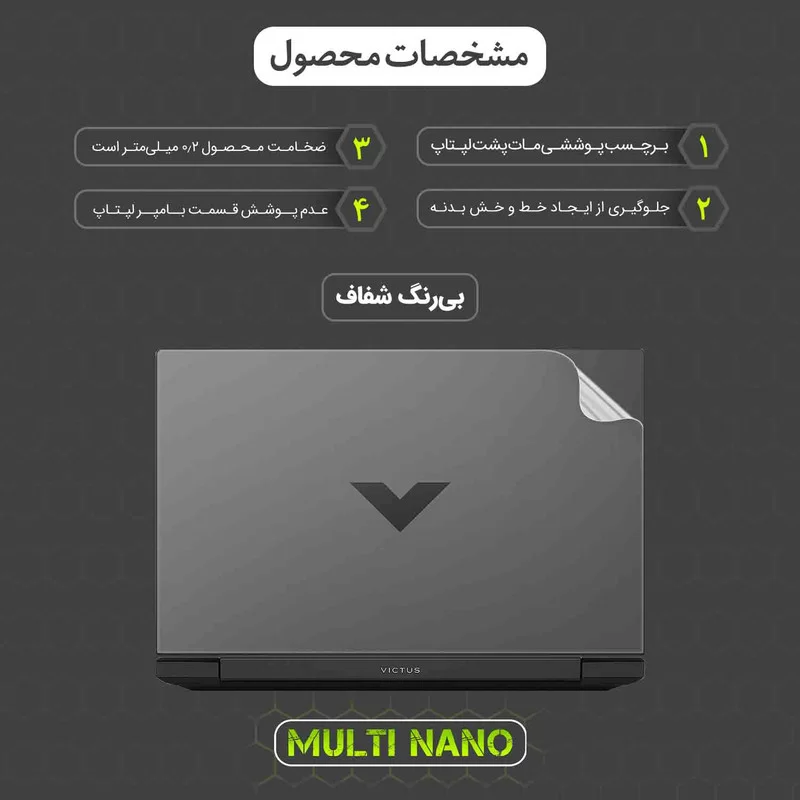 اگر به دنبال محافظی هستید که هم از بدنه لپتاپ اچ پی Victus 15 FB1013DX 2023 15.6 inch شما محافظت کند و هم ظاهر اصلی دستگاه را حفظ نماید، محافظ پشت مات نانو هیدروژل مولتی نانو مدل X-F1B انتخابی دقیق و کاربردی است. این محافظ از جنس فیلم نانو PPF (هیدروژلی خودترمیمشونده) ساخته شده و با ضخامت بسیار کم (حدود ۰.۲ میلیمتر) بدون ایجاد تغییر در فرم یا وزن دستگاه، از سطح پشتی لپتاپ در برابر خطوخش، گرد و غبار، چربی و تماسهای روزمره محافظت میکند. سطح مات و بیرنگ آن باعث میشود رنگ و بافت بدنه لپتاپهای مات بدون تغییر باقی بماند و از ایجاد لک، اثر انگشت و خط و خش جلوگیری میکند. طراحی دقیق و انعطافپذیر این محصول موجب میشود بهخوبی روی بدنه پشت لپتاپ بنشیند و جلوهای یکدست و تمیز ایجاد کند. برای نصب، کافی است پیش از چسباندن، سطح پشت لپتاپ و بخش چسبدار محافظ را کمی با شیشهشور اسپری کرده و با کارت نرم یا دستمال بدون پرز حباب و مایع اضافی را خارج کنید تا نتیجهای صاف و بدون رد حاصل شود. این محافظ با چسبندگی بالا، خاصیت خودترمیمی، مقاومت در برابر لک و خطوخش و ظاهر مات، گزینهای ایدهآل برای کاربرانی است که به دنبال محافظی نامرئی، مقاوم و سازگار با بدنه لپتاپ هستند.